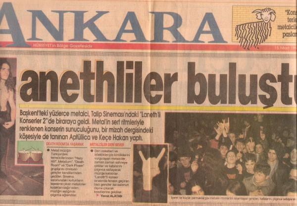 Lanethli Konserler II bu defa Ankara’daki Talip Sineması’nda düzenlendi ve önceki Lanethli Konserler’den Hazy Hill ile Metalium’a ek olarak Deathroom ve Darkphase ayarlandı. İlk olarak Darkphase, sonra Metalium, ardından Hazy Hill ve en son Deathroom sahneye çıktı ancak bu konsere çıkan kavgalar ve polis gerilimi damgasını vurdu. İstanbul’dan gelen seyirci grubu ile yerli seyircilerin bir kısmı arasında kavga cereyan etti ve polis de müdahale etmek istedi. Organizasyon olayların durulacağı konusunda söz verince polis müdahaleden vazgeçti ancak olaylar beklenenin aksine dinmedi. Tam tersine yerli seyirci grubu, İstanbulluların saldırısı üzerine fazladan adam toplayıp meydan kavgasına başladı. Öte yandan komiser, organizasyondan Çağlan Tekil’i bir odaya aldı ve hakaretler yağdırarak polislerin oruçlu olduğunu, konserin saat beşte biteceğini söyledi. Konser izni sekize kadardı. Postere göre kapı açılışı saat ikideydi ve Darkphase üçte çıkacaktı. Bu durumda konserin yetişmesi mümkün değildi. Nitekim Metalium’un performansı esnasında sahne önünde çıkan kavga bahane edilerek konser iptal edildi. Ancak Critical Mass vokalisti Savaş Demirkaya sahneye çıkıp öyle bir konuşma yaptı ki, hem seyirci coştu hem de polis iptal kararından vazgeçti. Böylece Metalium kaldığı yerden devam etti. Hazy Hill, Çağlan Tekil’in anlatısına göre sönük bir performans sergiledi ve normalden daha uzun çaldı . Son saatlere doğru seyircinin yarısı salonu terk etse de Çağlan Tekil’e göre en etkili performans ise Deathroom’a aitti. Pungent Stench’ten “Extreme Deformity” şarkısı ile başlayan Deathroom esnasında günün sahne dalışı ve pogo rekoru kırıldı. Haşat olan on bir koltuk ve inen kulis camları haricinde, bir sinema konseri için fena sayılmayacak bir hasarla organizasyon tamamlandı. Lanethli Konserler II’de olaylar konser sonrası da devam etti. Nicky’s isimli barda oturan İstanbullu seyirci grubundan on kişi, mekanın ihbarı sonucu polis tarafından gözaltına alınmıştı. Bunu duyan Laneth ekibi karakola gidip gençlerin salıverilmesini talep etti, gençler yaklaşık bir buçuk saat sonra salındı.